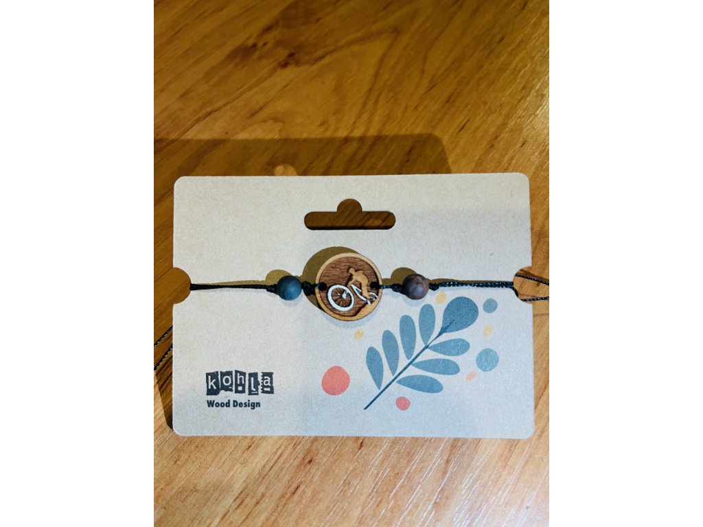 Motiv cyklisty na dřevěném přívěsku zachycuje volnost pohybu, vítr ve vlasech a radost z cesty. Lávové kameny dodávají sílu, stabilitu a připomínají kontakt se zemí, kterou pod koly míjíš.