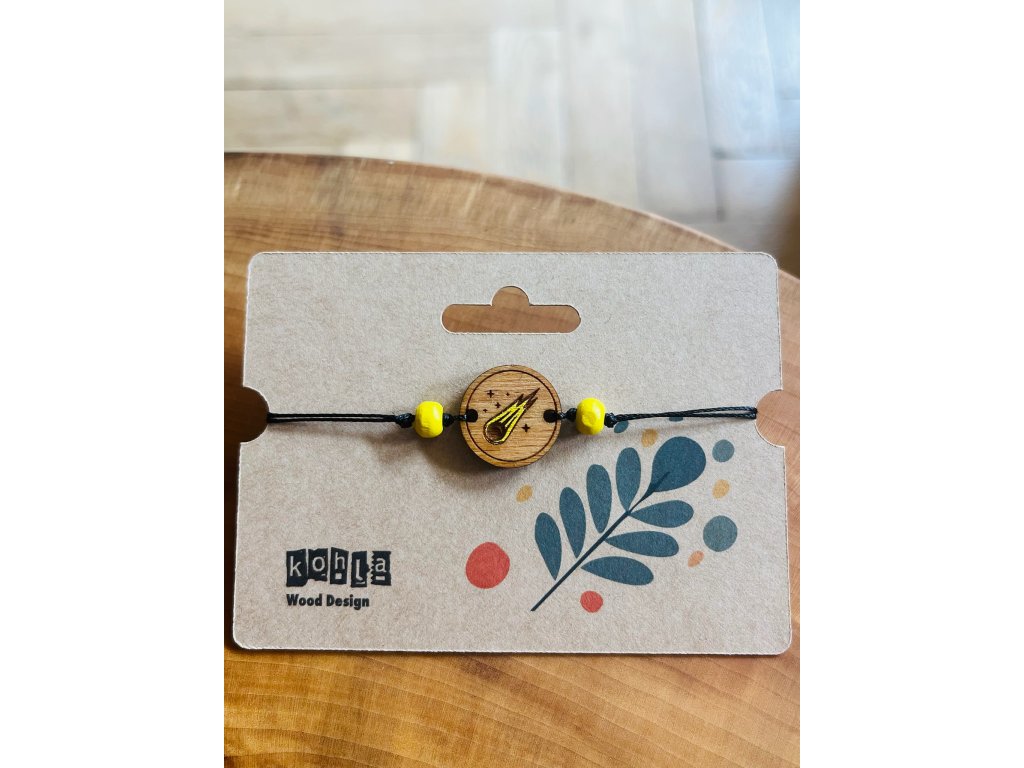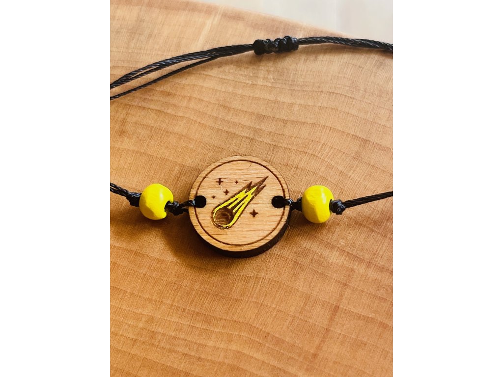 Dřevěný medailon doplněný o žluté korálky přináší energii a radost do každodenního života. Symbol meteoritu odkazuje na vesmírné síly a pohyb hvězdných těles.
